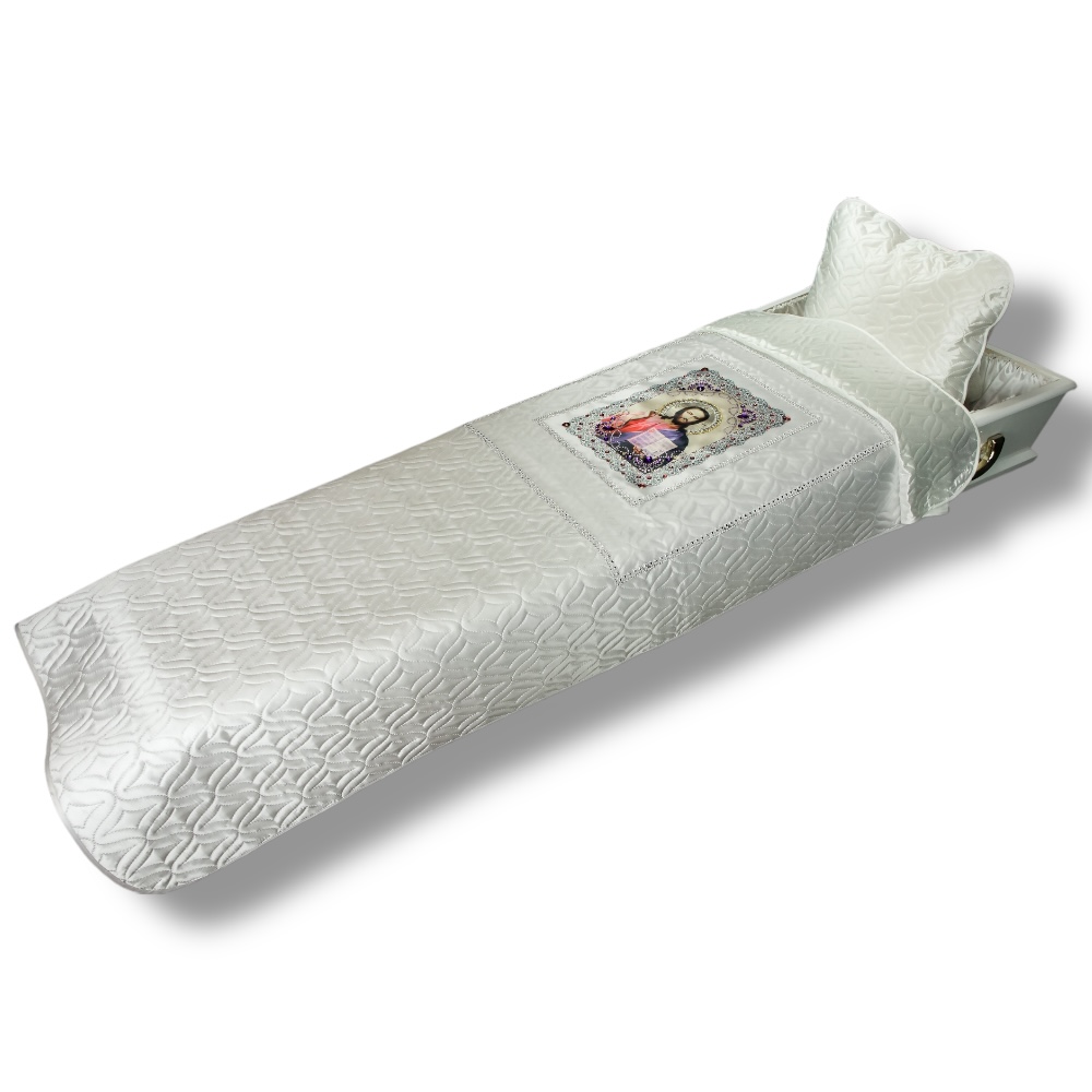 АРТ КР-008 Спаситель. Комплект в гроб ритуальный. Покрывало+наволочка. Атлас+термостежка. Белый