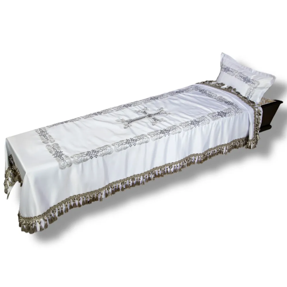 АРТ ПБ-ГР-4 Элит серебро. Григорианский ритуальный комплект в гроб. Покрывало+наволочка. Парча. Серебро