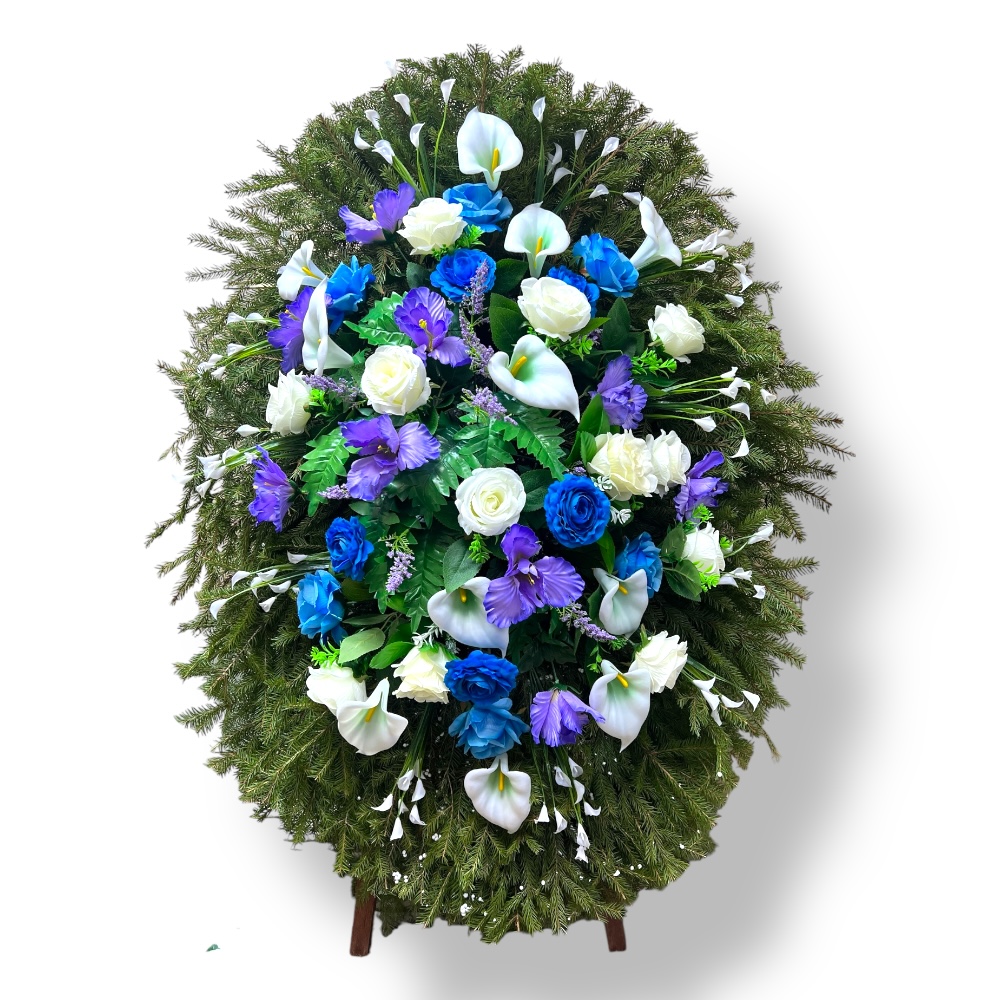 Арт. ВК-005 Венок на подставке с живой хвоей и искусственными цветами на похороны 120 см.