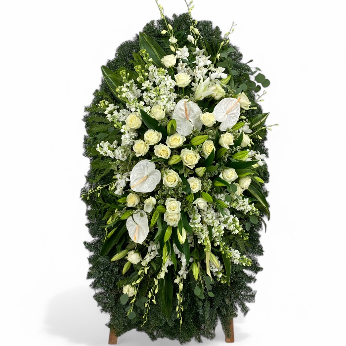 Арт. ВЖ-003 Венок из живых цветов Авторский / Антуриум, розы, орхидеи, лилии / траурный венок на похороны 120 см.