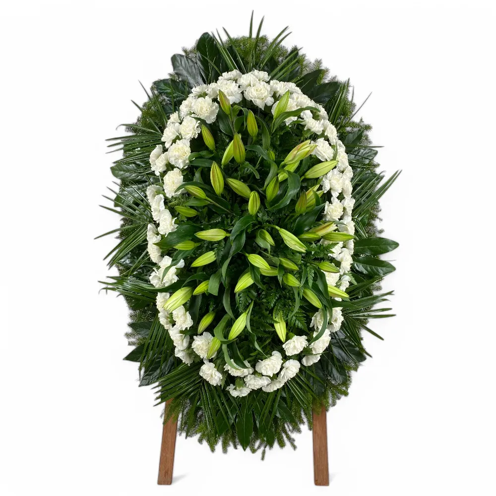 Арт. ВЖ-027 Венок из живых цветов на похороны / Лилии, гвоздики 120 см.