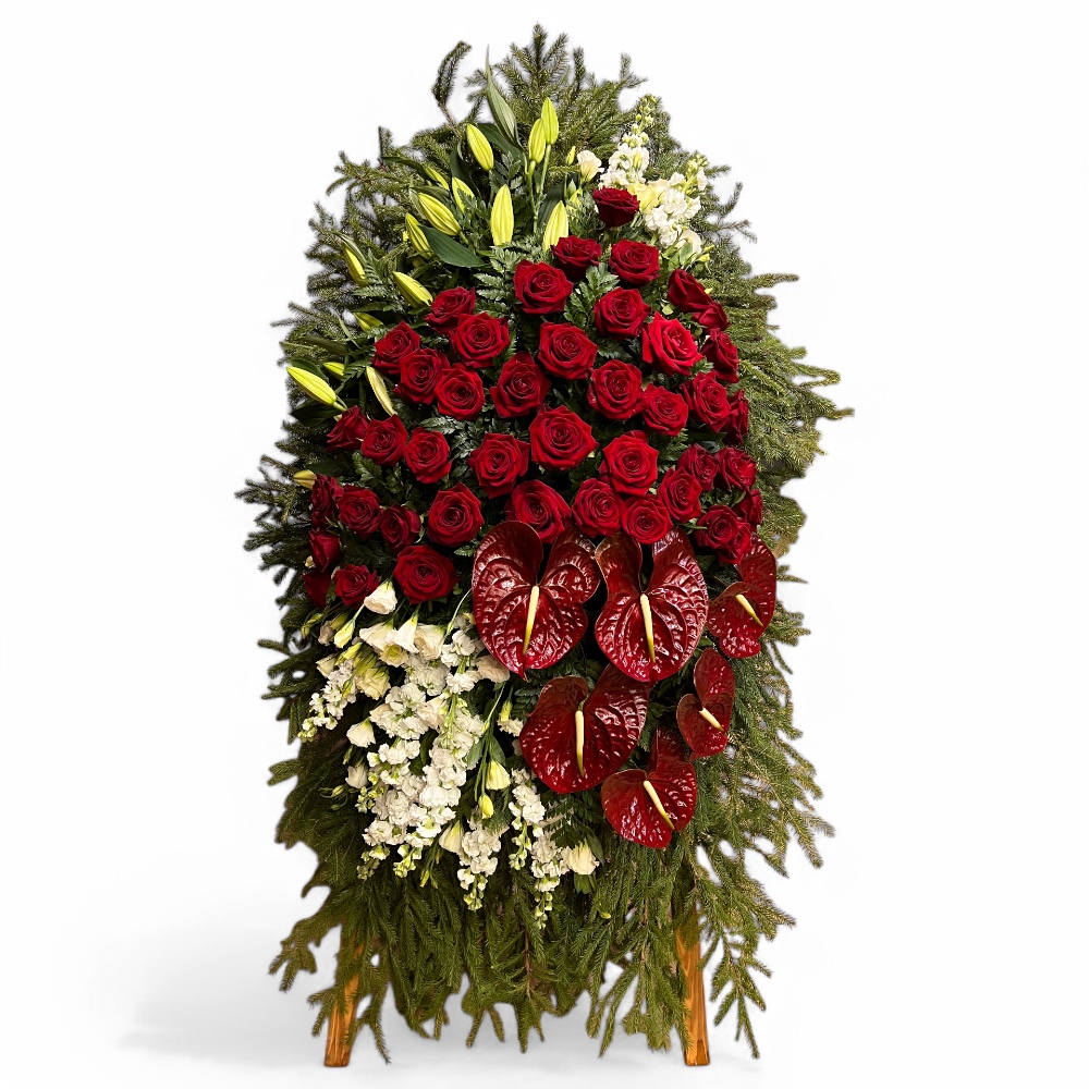 Арт. ВЖ-047 Венок из живых цветов на похороны: Лизиантус, розы, лилии, орхидеи, антуриум 120 см.